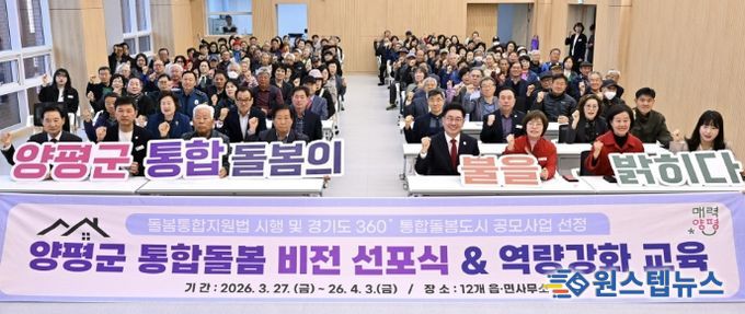 원스텝뉴스 천규영 기자 | 양평군은 ‘의료·요양 등 지역 돌봄의 통합지원에 관한 법률’ 시행일인 지난달 27일 개군면을 시작으로 4월 3일까지 진행한 ‘양평군 통합돌봄 비전 선포식 및 역량 강화 교육’을 성황리에 마무리했다고 밝혔다.