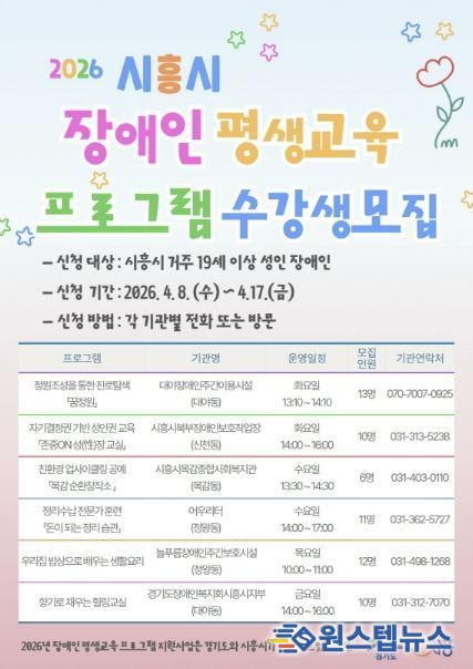 원스텝뉴스 이병희 기자 | 시흥시가 관내 성인 장애인의 학습권 보장과 사회참여 확대를 위해 ‘2026년 장애인 평생교육 프로그램 지원사업’을 본격적으로 시작하며, 4월 8일부터 17일까지 프로그램 운영을 위한 학습자를 모집한다.