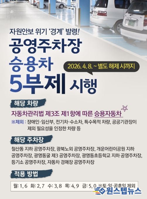 5부제 적용 대상은 ▲철산동 지하공영주차장, 광북 노외 공영주차장, 광명동초등학교 지하공영주차장, 광명동굴 제3공영주차장, 개운어린이공원 지하공영주차장 등 노외주차장 5곳과 ▲등기소 공영주차장, 자동차 경매장 공영주차장 등 노상주차장 2곳이다.