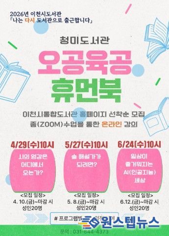 원스텝뉴스 천규영 기자 | 이천시 청미도서관은 이천시 도서관의'나는 다시 도서관으로 출근합니다'와 연계한 '오공육공 휴먼북'을 운영한다. 이번 행사는 은퇴 세대의 풍부한 사회 경험과 전문 지식을 지역사회의 교육 자원으로 활용하고 청소년과 청년과의 소통을 통해 지역 멘토로서의 역할을 확대하고자 기획됐다.