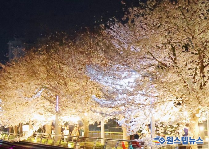 ‘금석첨화’ 의 매력은 낮과 밤을 가리지 않고 빛나고 있다. 한낮에는 파란 하늘 아래 흩날리는 벚꽃이 화사한 봄의 절정을 보여주고 있으며 야간에는 산책로를 은은하게 밝히는 경관조명이 가동되어 로맨틱한 봄의 분위기를 연출하며 늦은 저녁 시간에도 야간 벚꽃 산책을 즐기며 사진을 남기는 시민들로 북적였다.