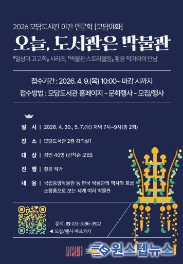 원스텝뉴스 천규영 기자 | 김포시 모담도서관에서는 4월 30일과 5월 7일 저녁 7시부터 9시까지 ‘오늘, 도서관은 박물관’ 강좌를 운영한다.