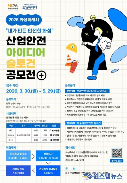 원스텝뉴스 이병희 기자 | 화성산업진흥원(원장 전병선)은 산업재해 예방과 안전문화 확산을 위한 ‘2026년 화성특례시 산업안전 아이디어·슬로건 공모전’을 개최하고 오는 5월 29일까지 참가자를 모집한다.