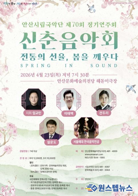 원스텝뉴스 천규영 기자 | 안산시는 오는 23일 오후 7시 30분 안산문화예술의전당 해돋이극장에서 안산시립국악단 제70회 정기연주회 '신춘음악회 SPRING IN SOUND'를 개최한다고 13일 밝혔다.