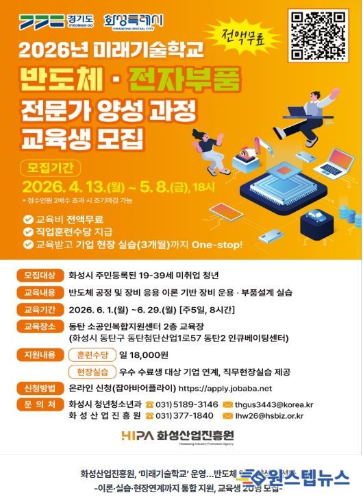 원스텝뉴스 이병희 기자 | 화성산업진흥원(원장 전병선)에서 지역 기술 인력 양성을 위해 ‘2026년 미래기술학교’를 추진하고 반도체·전자부품 전문가 양성과정 교육생을 모집한다.