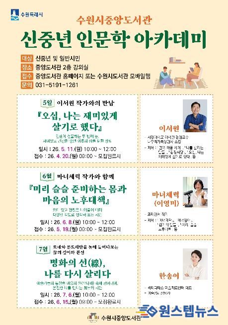 원스텝뉴스 이병희 기자 | 수원시 중앙도서관이 5월부터 7월까지 매달 1회 운영하는 ‘신중년 인문학 아카데미’ 수강생을 모집한다.