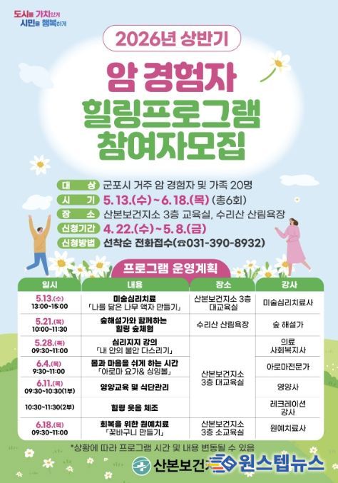 원스텝뉴스 이병희 기자 | 군포시 산본보건지소는 오는 5월 13일부터 6월 18일까지 총 6회에 걸쳐 암 경험자와 그 가족 20여 명을 대상으로 암 경험자 자조모임인 ‘봄·봄·봄 프로그램’을 운영한다.