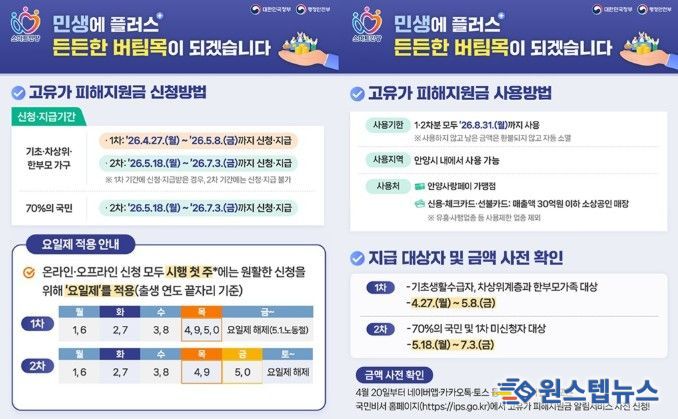 소득 하위 70%(1차 미신청한 기초생활수급자・차상위계층・한부모가족 포함)를 대상으로 하는 2차 신청 기간은 5월 18일부터 7월 3일 오후 6시까지다.