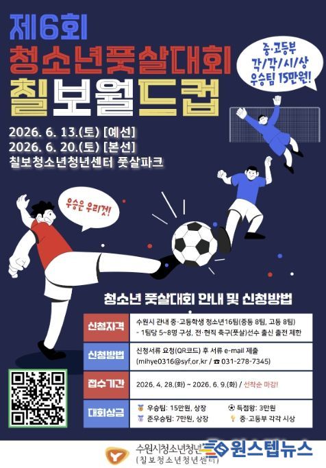 칠보청소년청년센터 관계자는 “청소년들이 학업 스트레스에서 벗어나 그라운드에서 마음껏 기량을 펼치며 건강한 에너지를 발산하기를 바란다”며, “안전한 대회 운영을 위해 최선을 다해 준비하고 있으니 수원시 청소년들의 많은 관심과 참여를 기대한다”고 전했다.