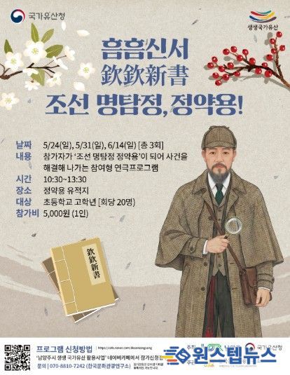 원스텝뉴스 천규영 기자 | 남양주시는 오는 5월 24일과 31일, 6월 14일 정약용 유적지에서 초등학교 고학년을 대상으로 참여형 연극 프로그램 ‘흠흠신서: 조선 명탐정, 정약용!’ 참가자를 모집한다고 밝혔다.
