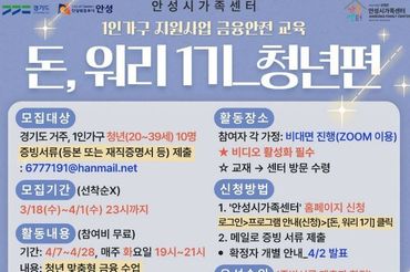 안성시 가족센터, 1인 가구 지원사업...금융안전 교육 '돈, 워리 1기' 청년 참여자 모집