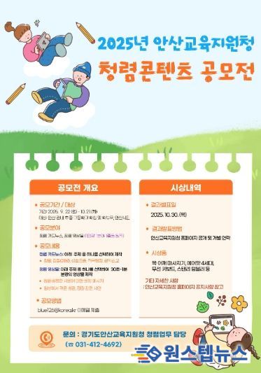 원스텝뉴스 이병희 기자 | 경기도안산교육지원청은 9월 22일부터 10월 21일까지 한 달간 ‘2025년 청렴 콘텐츠 공모전’을 개최한다고 밝혔다.