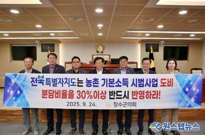 원스텝뉴스 이병희 기자 | 장수군의회는 24일 본회의장에서 의원 전원이 참석한 가운데 농어촌 기본소득 국가 시범사업 추진 과정에서 도비 분담비율을 반드시 30% 이상 반영할 것을 전북특별자치도에 강력히 촉구했다.