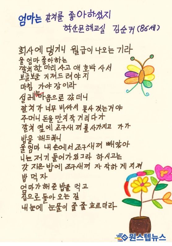 원스텝뉴스 이병희 기자 | 함안군은 ‘문해, 세상이 달라 보여요’를 주제로 열린 2025년 성인문해의 달 시화 부문 공모전에서 관내 성인문해교육 수강생 7명이 수상하는 성과를 거뒀다고 24일 밝혔다.