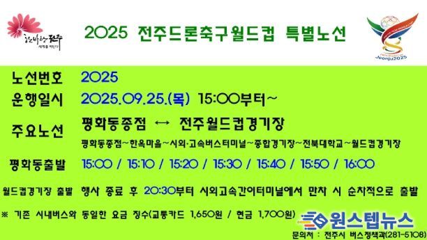 전주시 관계자는 “개막식과 시상식 당일에는 ‘2025 전주드론축구월드컵 특별노선’을 적극 이용해 달라”며 “행사 당일 경기장 주변 혼잡이 예상되므로 자가용 이용을 자제하고 대중교통을 활용해 주시길 바란다”고 당부했다.