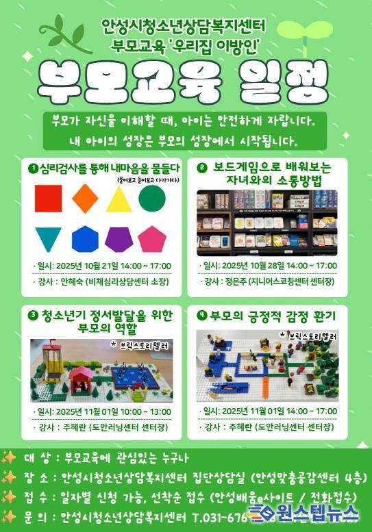 원스텝뉴스 이병희 기자 | 안성시청소년상담복지센터는 오는 10월과 11월, 총 4회에 걸쳐 청소년 자녀를 둔 부모를 대상으로 ‘부모교육’을 진행한다고 밝혔다. 이번 교육은 자녀와의 원활한 소통과 부모의 심리적 소진 예방을 돕기 위해 마련됐다.