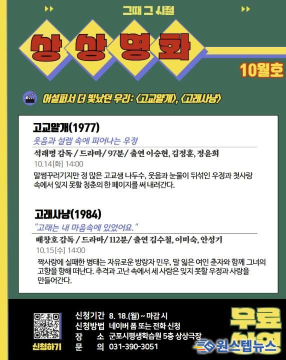 원스텝뉴스 천규영 기자 | 군포문화재단 군포시평생학습원은 시민들의 문화 향유와 세대 공감을 위해 오는 10월 14일과 15일 상상극장에서 고전 영화 상영 프로그램 〈상상명화〉를 운영한다. 이번 상영작은 ‘고교얄개’와 ‘고래사냥’으로 무료 상영된다.