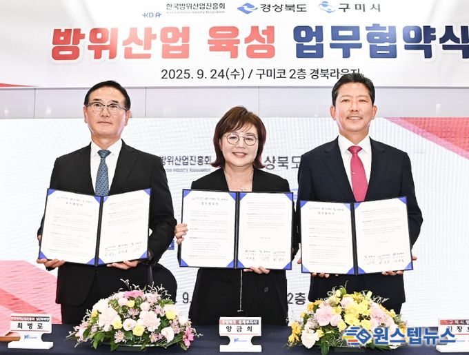 원스텝뉴스 이병희 기자 | 경상북도는 한국방위산업진흥회, 구미시와 24일 구미코에서, 기관 간 방위산업 전문인력양성, 정보교류 등 다양한 분야 협력을 위한 업무협약을 체결했다.