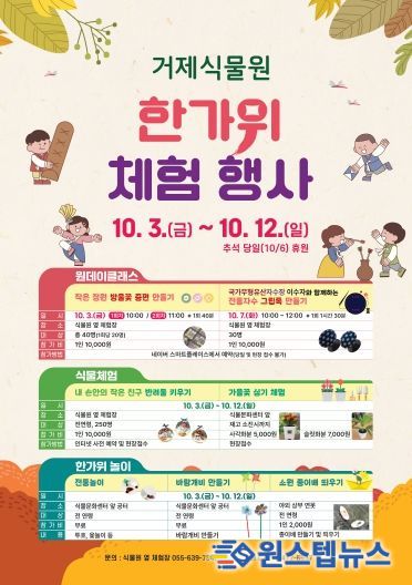 특히, 올해는 방문객들이 우리 고유의 손맛과 멋을 직접 경험할 수 있도록 증편 만들기 원데이클래스(10월 3일 금요일, 2회)와 전통 자수 원데이클래스(10월 7일 화요일, 1회)를 새롭게 선보인다. 이와 함께 온 가족이 함께 즐길 수 있는 전통 놀이 체험도 마련되어 명절의 흥겨움을 더할 것으로 기대된다. 상세한 사항은 거제식물원 홈페이지에서 확인할 수 있다.