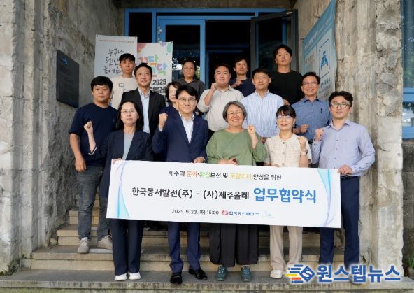 원스텝뉴스 이병희 기자 | 한국동서발전㈜(사장 권명호) 제주사업추진단과 (사)제주올레(대표이사 안은주)는 23일 15시 서귀포 제주올레여행자센터에서 ‘제주의 문화·자연환경 보전 및 지역인재 양성을 위한 업무협약’을 체결했다.