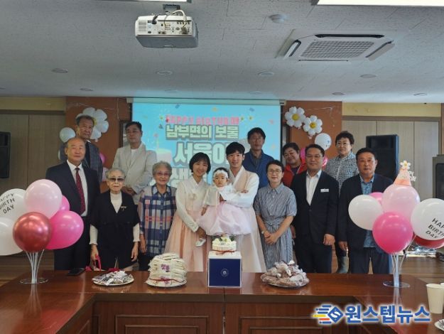 행사장은 풍선과 현수막으로 따뜻하게 꾸며졌으며, 남부면 직원들이 준비한 케이크와 지역사회보장협의체가 마련한 떡, 그리고 주민자치위원회·발전협의회·이장협의회가 함께 준비한 축하금 50만 원이 전달됐다. 서율이 가족은 정성껏 마련한 답례품을 전하며 감사의 마음을 나눴다.
