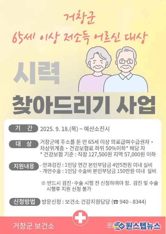 지원 대상은 거창군에 거주하는 의료급여수급권자 및 건강보험료 기준(직장가입자 127,500원 이하, 지역가입자 57,000원)에 해당하는 65세 이상 노인이다. 대상자에게 안과 검진과 개안수술을 지원하여 이를 통해 시력 저하로 겪는 일상생활 불편과 심리적 위축을 줄이고, 어르신들 삶의 질 향상과 사회적 고립 예방에도 기여할 것으로 기대된다.