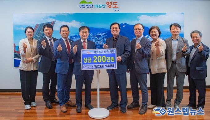 이날 이웃돕기 성금은 관내 취약계층 지원을 위한 영도구↔(주)엔백과의 상호 업무협약 체결의 일환으로 전달됐으며, 정영훈 총괄대표, 정진호 상무, 이기우 본부장이 참석했다.