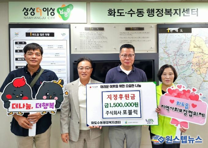 원스텝뉴스 이병희 기자 | 남양주시는 24일 화도읍에 소재한 제조 업체인 ㈜포블릭이 추석 명절을 앞두고 후원금 150만 원을 화도읍 지역사회보장협의체에 기탁했다고 밝혔다.