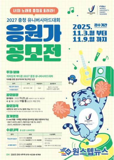 원스텝뉴스 이병희 기자 | 2027 충청 유니버시아드대회 조직위원회는 대회의 성공 개최와 국민적 관심 제고를 위해 공식 응원가 공모전을 개최한다고 25일 밝혔다.