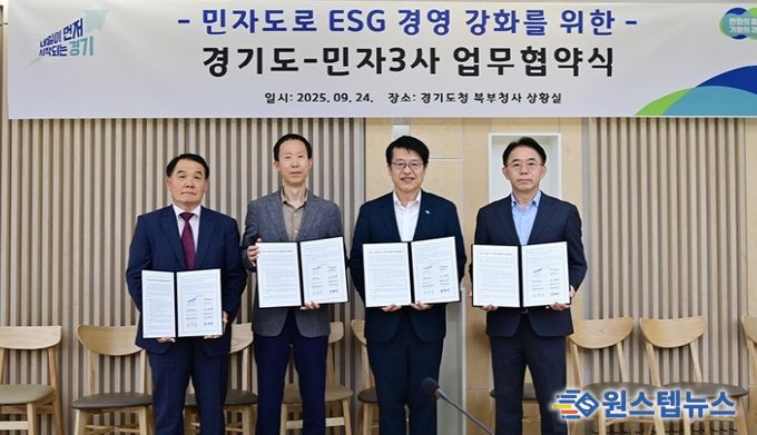 원스텝뉴스 이병희 기자 | 경기도는 24일 경기도청 북부청사에서 경기남부도로(주), 제삼경인고속도로(주), 일산대교(주) 등 도내 민자도로 사업자 3개사와 ESG(환경·사회·투명) 경영 강화를 위한 업무협약을 체결했다.