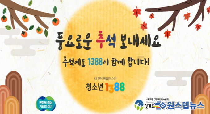 원스텝뉴스 이병희 기자 | 경기도는 개천절과 추석, 한글날이 이어지는 10월 3일부터 9일까지 연휴 기간에도 ‘청소년전화 1388’을 24시간 운영해 위기 청소년 상담과 발견·구조 서비스를 지원한다고 1일 밝혔다.