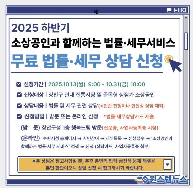 원스텝뉴스 이병희 기자 | 수원시 장안구는 오는 10월 13일부터 법률·세무 상담을 받기 어려운 관내 전통시장 및 골목형 상점가 소상공인을 대상으로 쉽고 편리하게 상의할 수 있는 무료 상담인 ‘소상공인과 함께하는 법률·세무 서비스’ 사업을 운영한다.