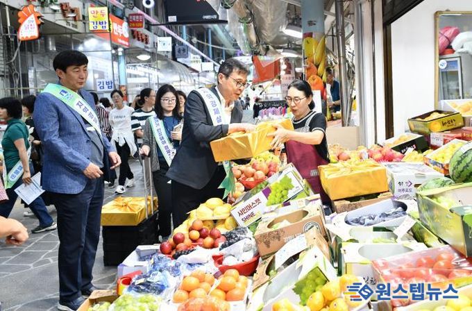 원스텝뉴스 이병희 기자 | 수원특례시 영통구는 지난 9월 30일, 다가오는 2025년 추석 명절을 앞두고 영통구 유일의 전통시장인 구매탄시장을 방문해‘전통시장 장보기 행사 및 물가안정 캠페인’을 진행했다.