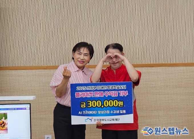 원스텝뉴스 이병희 기자 | 의정부도시교육재단은 장애인평생학습도시 사업의 일환으로 운영된 'AI 크리에이터 양성과정' 장애인 수강생들이 직접 제작한 상품 판매 수익금을 지역사회에 기부했다고 30일 밝혔다.