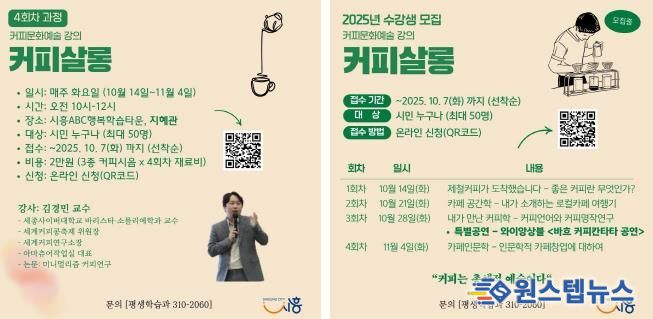 원스텝뉴스 이병희 기자 | 시흥시는 민간주도형 지역축제 지원사업인 ‘2025년 시흥시 지역특화 관광축제 지원사업’에 선정된 ‘세계 커피콩 축제’의 사전 연계 프로그램으로 커피문화예술 특강 ‘커피살롱’을 오는 10월 14일부터 11월 4일까지 시흥ABC행복학습타운 지혜관에서 총 4회에 걸쳐 진행한다.