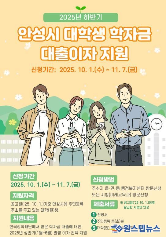 원스텝뉴스 이병희 기자 | 안성시는 오는 10월 1일부터 11월 7일까지 ‘2025년도 하반기 안성시 대학생 학자금 대출이자’ 지원 신청을 받는다.
