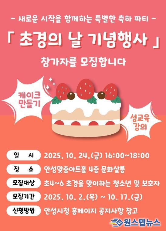 원스텝뉴스 이병희 기자 | 안성시는 초경의 날을 맞이하여 오는 10월 24일 금요일 안성맞춤아트홀 4층 문화살롱에서 개최되는 '2025년 초경의 날 기념행사' 참여자를 오늘(2일)부터 모집한다고 밝혔다.