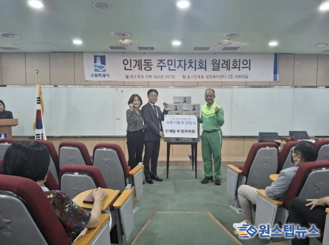 원스텝뉴스 이병희 기자 | 수원시 팔달구 인계동 주민자치회는 지난 10월 1일, 가을철 관내 낙엽청소용 송풍기 벨트(100만 원 상당)를 인계동 행정복지센터에 전달했다.