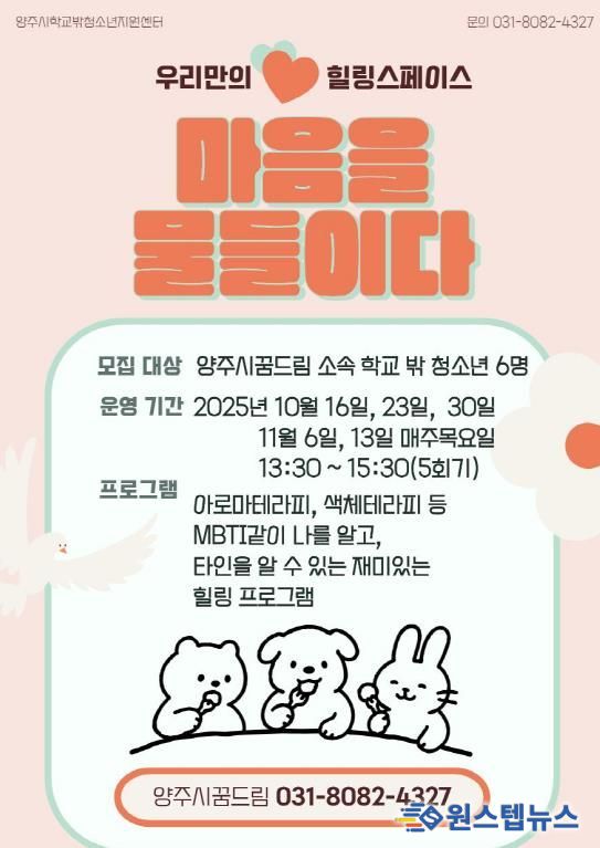 센터 관계자는 “양주시 꿈드림의 집단상담은 단순한 상담 프로그램을 넘어 청소년이 스스로를 돌아보고, 또래와 함께 성장해가는 소중한 시간”이라며, “앞으로도 청소년 눈높이에 맞춘 다양한 맞춤형 프로그램을 지속적으로 제공하겠다”고 전했다.