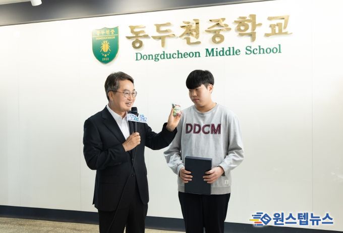 원스텝뉴스 이병희 기자 | 김동연 경기도지사가 16일 동두천중학교를 찾아 노점 할머니께 비상금을 건넨 선행으로 화제가 된 옥현일 군에게 표창을 수여했다.