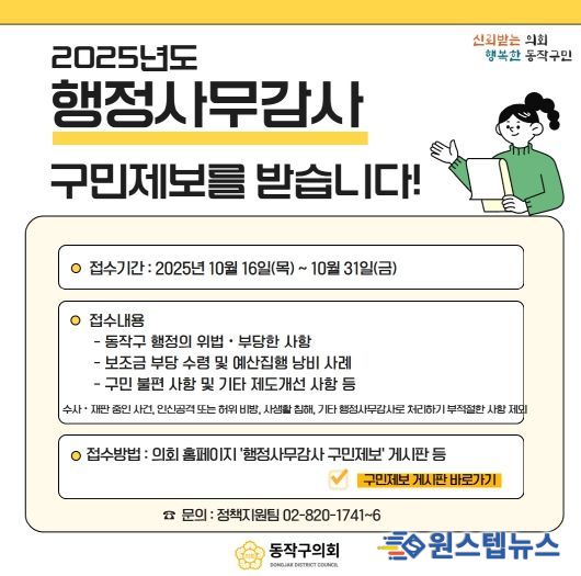 원스텝뉴스 이병희 기자 | 동작구의회는 오는 11월 25일부터 9일간 진행되는 ‘2025년도 행정사무감사’를 앞두고, 10월 16일부터 31일까지 구민 제보를 접수한다.