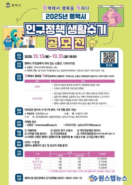 원스텝뉴스 이병희 기자 | 평택시는 2025년 평택시 인구정책 생활수기 공모전 ‘평택에서 행복을 택하다’를 오는 10월 31일까지 개최한다고 밝혔다.