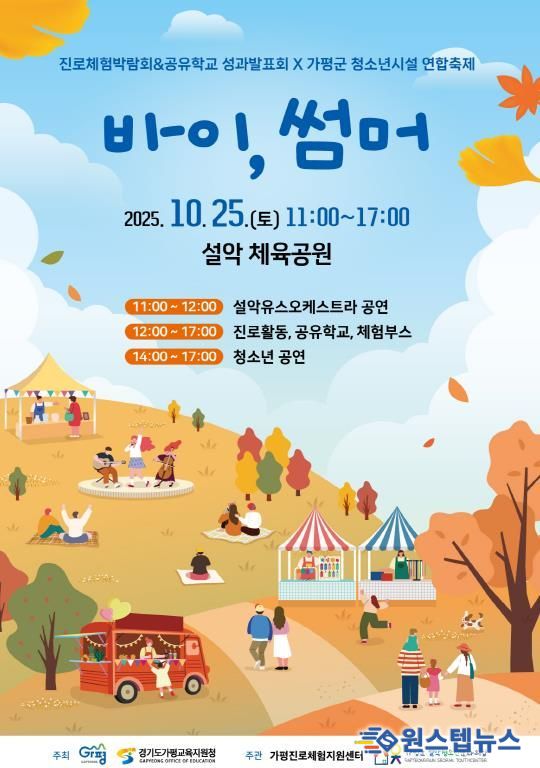 원스텝뉴스 이병희 기자 | 가평교육지원청은 10월 25일 11:00시부터 설악청소년 문화의 집 및 설악생활체육공원 일대에서 ‘2025 가평진로체험박람회·공유학교 성과발표회X'바이,썸머'청소년시설 연합축제’를 개최한다.