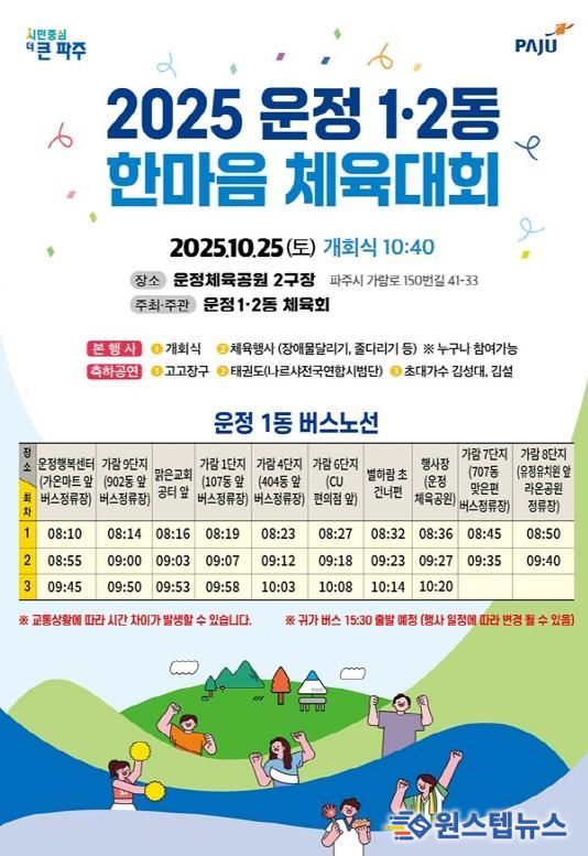 원스텝뉴스 천규영 기자 | 운정1·2동 체육회는 오는 25일 운정체육공원(가람로 150번길 41-33)에서 ‘2025 운정1·2동 한마음 체육대회’를 개최한다고 밝혔다.