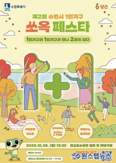 오는 26일 오후 수원 광교호수공원에 가면 시민 누구나 호숫가에서 걷기 운동을 하며 이웃을 만들 수 있다. ‘제2회 수원시 1인가구 쏘옥 페스타 1+1’이 1인가구와 시민들을 연결하는 폭넓은 소통의 장을 마련한다. 1인가구에 도움이 되는 다양한 정보를 얻고, 1인가구라서 느끼는 고민을 서로 나누고, 취미가 맞는 1인가구끼리 새 친구가 되는 기회다. 운이 좋으면 1만원의 당근머니도 받게 되는 가을 소풍을 즐겨보자.