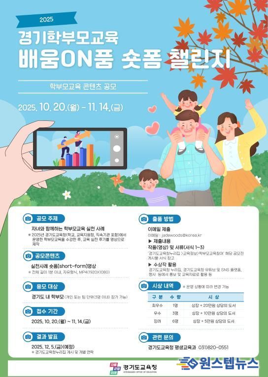 원스텝뉴스 이병희 기자 | 경기도교육청이 학부모의 교육 참여문화 확산과 가정의 배움 문화 조성을 위한 ‘2025 경기학부모교육 콘텐츠 공모전(배움 온(ON)품 숏폼 챌린지)’을 개최한다.
