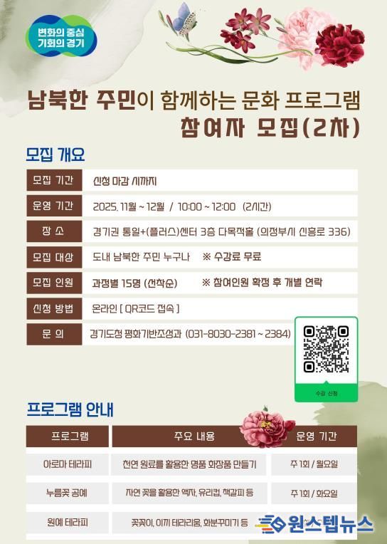 프로그램 참여는 홍보 포스터 내 QR코드로 접속해 신청하거나 경기권 통일플러스센터 누리집을 통해 신청하면 된다. 경기도에 거주하는 남북한 주민 누구나 참여 가능하며, 더 많은 주민이 체험프로그램에 참여할 수 있도록 1회만 신청 가능하다.