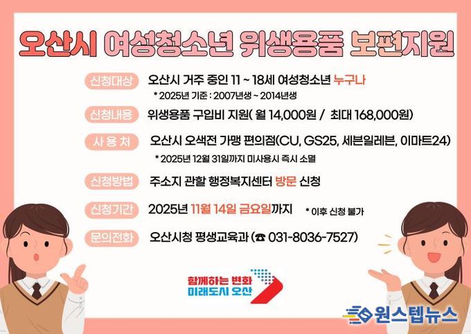 원스텝뉴스 이병희 기자 | 오산시는 여성청소년의 건강권 보장과 보편적 복지 실현을 위해 올해 처음 시행한 ‘여성청소년 위생용품 보편지원사업’의 신청을 오는 11월 14일 마감한다. 아직 신청하지 않은 대상자는 혜택을 받을 수 있도록 서둘러 참여해야 한다.