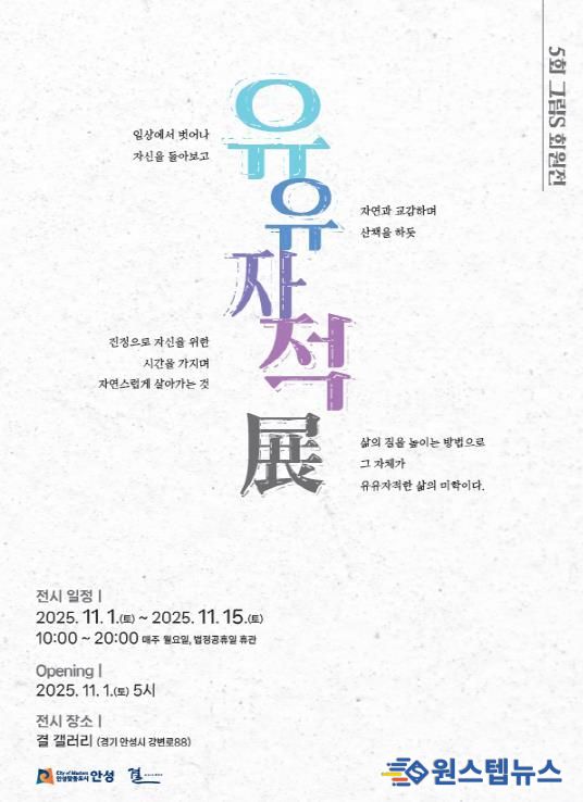 원스텝뉴스 천규영 기자 | 안성천 우리동네 작은미술관 결갤러리에서는 오는 11월 1일부터 15일까지 그림스아뜰리에 제5회 회원전 ‘유유자적’이 열린다. 이번 전시는 바쁜 일상 속에서 잠시 걸음을 멈추고, 자연과 교감하듯 마음을 산책하는 여유의 시간을 주제로 마련됐다.