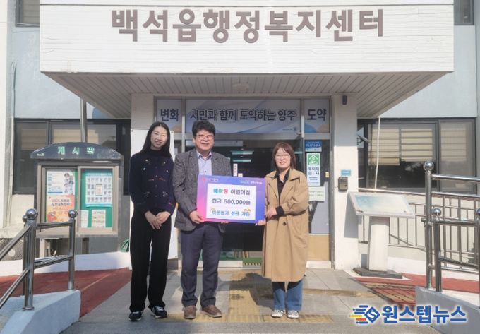 원스텝뉴스 이병희 기자 | 양주시 백석읍 소재 예하랑어린이집이 최근 아나바다(아껴 쓰고 나눠 쓰고 바꿔 쓰고 다시 쓰기) 행사를 통해 마련한 수익금 50만 원을 기부했다.